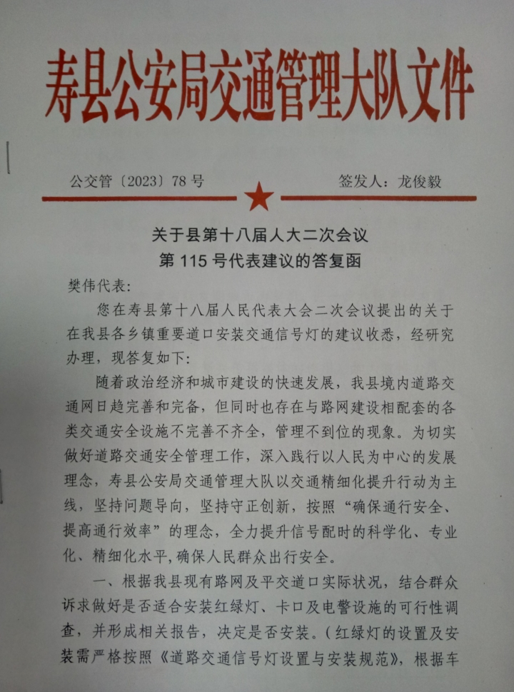 2023年8月31日,寿县公安局交通管理大队以公交管【2023】78号红头文件对寿县人大代表樊伟提出的115号代表建议进行了答复,答复函具体内容见红头文件照片。