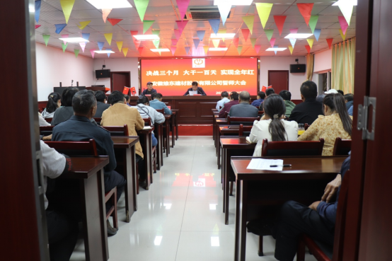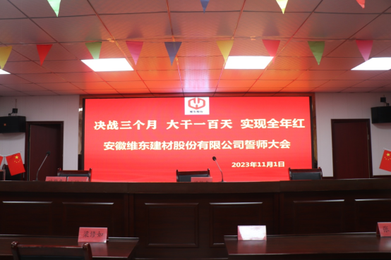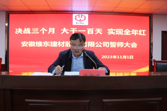坚定信心,咬定目标,擎旗奋进,誓夺全胜。2023年11月1日下午,安徽维东建材股份有限公司召开“决战三个月、大干一百天、实现全年红”动员誓师大会,公司中高层领导、各部门、各车间负责人、综合办、财务部、生产部、营销中心(合肥办事处)、品管部、安环部、检验检测中心、运输部、后勤保障部等部门全体员工参加会议,公司行政副总叶敬忠主持会议并宣读维东字[2023]13号红头文件,各位副总经理就各自分管的工作进行总结,对下一步工作进行安排,并提出意见建议,新任职的中高层领导上台作了表态发言,公司董事长、总经理梁维东在会上做了重要讲话,总结前一阶段工作,对今后三个月工作进行了安排部署。