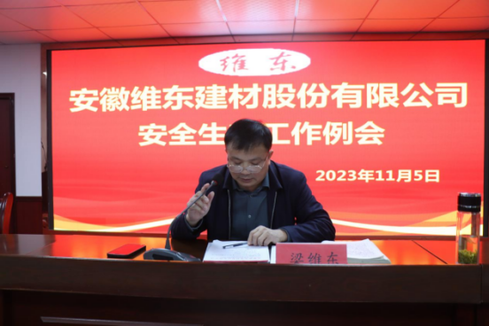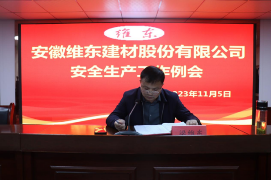 2023年11月5日下午,安徽维东建材股份有限公司召开交通安全和安全生产工作例会,公司董事长、总经理梁维东主持会议并作重要讲话,公司中高层领导、有关部门负责人、兼职安全员、货物运输部全体驾驶员、装卸货物的叉车操作工、公司机动轿车驾驶员出席会议。会议首先组织参会人员集体观看了交通安全、安全生产警示教育视频,然后进入表态发言环节,公司分管货物运输部的副总经理张庆云、分管安全环保的副总经理杨扬、分管行政工作的副总经理叶敬忠、后勤保障部主任程春、货物运输部主任梁永喜等中高层管理人员分别在会议上表态发言,就各自分管及负责的工作领域涉及交通安全、安全生产方面提出整改措施和意见建议。