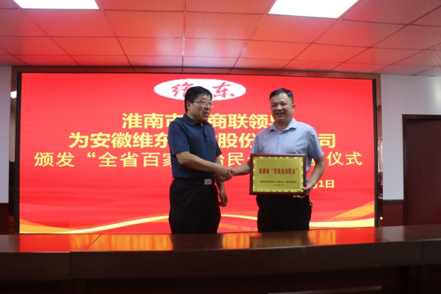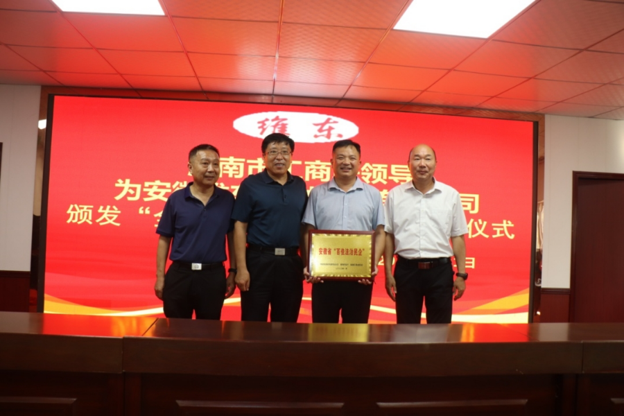 在授牌颁奖仪式上,市工商联主席杜本硕亲自将安徽省“百佳法治民企”铜牌颁发给公司董事长、总经理梁维东手中。
